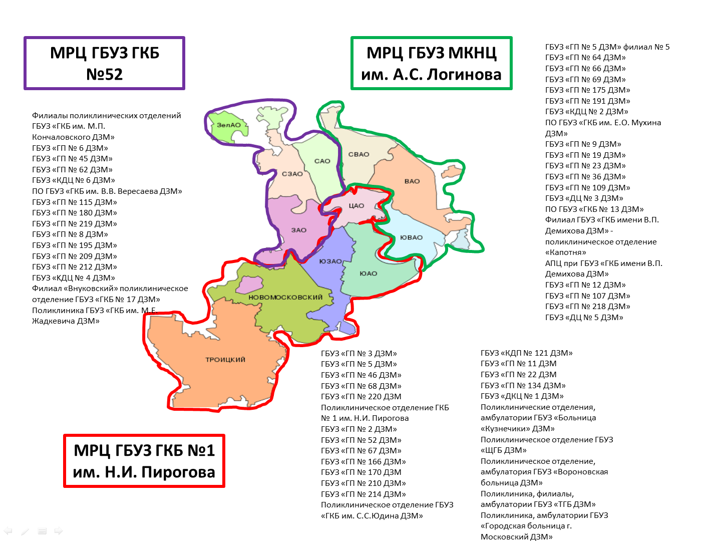 Было создано три межокружных ревматологических центра (МРЦ) на базе многофункциональных стационаров, а именно: ГБУЗ ГКБ №52, ГБУЗ ГКБ №1 им. Н.И. Пирогова, ГБУЗ МКНЦ им. А.С. Логинова. Каждый МРЦ содержит клинико-диагностический центр, дневной и круглосуточный стационары, кабинет генно-инженерной терапии, организационно-методический отдел и аптечный пункт. Москва делится на 3 зоны, каждая из которых прикрепляется к своему МРЦ.